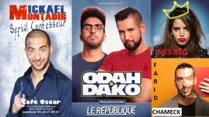 On ne présente plus Odah et Dako, le duo de comiques dont la joute verbale est absolument hallucinante ! Ces improvisateurs ont le vent en poupe depuis 2016 et font des apparitions régulières dans différents shows en plus d’être en spectacle au théâtre de Le République à Paris. Leur verve et leur enthousiasme a su charmer la nouvelle génération. Danseur de capoeira, opérateur, ouvrier agricole, Farid Chamekh a été un touche-à-tout avant de se lancer dans la comédie. Après une école de théâtre d’improvisation, il a été révélé grâce au Deb Jam du Jamel Comedy Club. Avec sa vision du monde, il traite avec humour et dérision de sujets sérieux qui font partie de notre quotidien. Inès Reg, quant à elle, est une humoriste qui aborde des sujets féminins tout en évitant les clichés. Avec un ton décontracté, elle fait rire son public à tous les coups. Mickael Montadir est aussi un passionné du rire qu’il transmet à travers le récit de ses aventures pleines d’humour et d’autodérision.