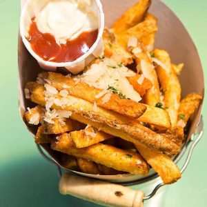 Pour les frites, celles-ci sont célèbres dans tout Barcelone pour leur recette particulière : saupoudrées de parmesan et de persil, impossible d’en laisser seulement une dans votre assiette.