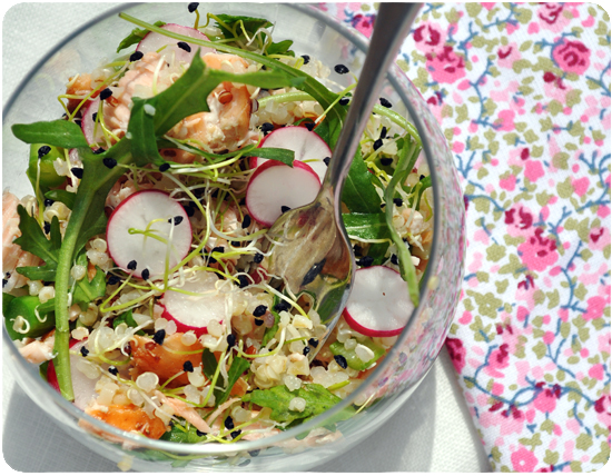 Pour un repas équilibré et raffiné, optez pour une salade de quinoa au saumon grillé, radis et graines germées.