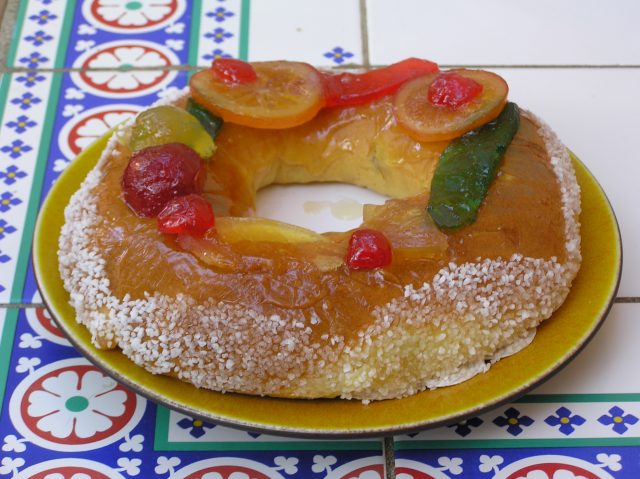 Enfin, vous pouvez aussi déguster le gâteau des Rois ou Tortell de Reis, à la fleur d’oranger et décoré de sucre et de fruits confits. La tradition veut qu’on mette deux fèves dont une figurine en porcelaine de la crèche de Noël. Celui qui tombe sur la fève est le roi ou la reine tandis que celui qui a la figurine devra payer le prochain gâteau !