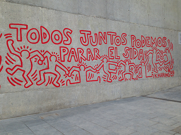 Les graffitis expliqués sont aussi bien des œuvres populaires que des artistes méconnus. On a donc l’occasion de voir des tags célèbres comme la réplique de l’œuvre réalisé par Keith Haring contre le sida en 1989 situé derrière le MACBA