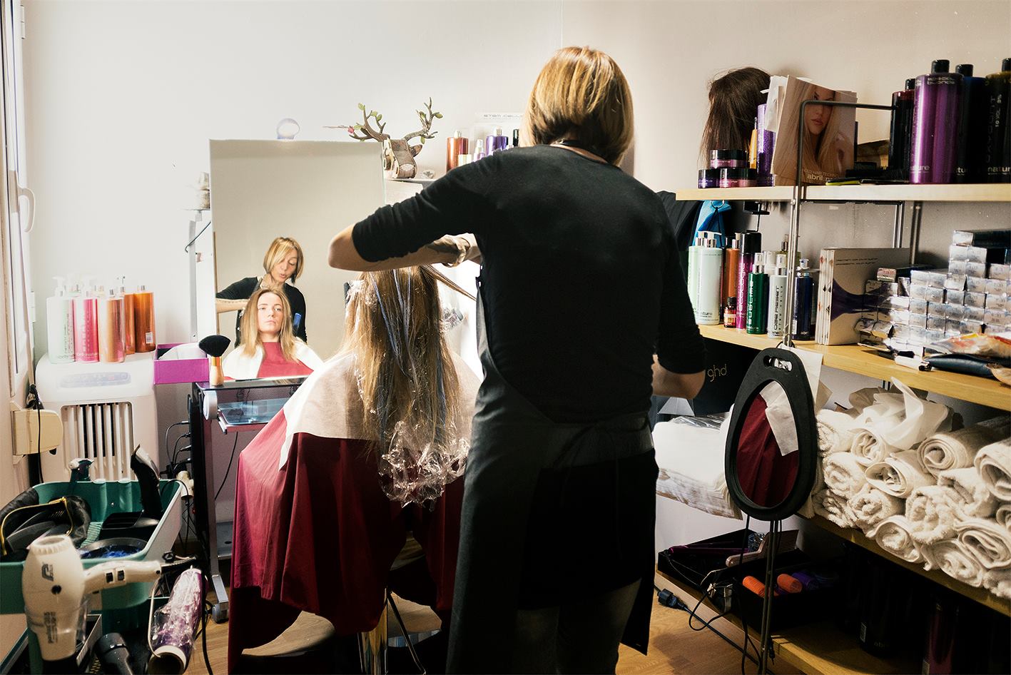C’est sans doute parce que Valérie a longtemps travaillé en salon de coiffure, et y a pris ses habitudes. Après un cursus en université de coiffure, elle a commencé sa carrière chez Jean-Louis David à l’âge de 20 ans. Un an après, elle était responsable du salon. Après Perpignan, Marseille et Avignon, elle est arrivée à Barcelone il y a 15 ans pour les franchises Jean-Louis David. Son CV est impressionnant : elle a formé dans les salons Jean-Louis David, a eu son propre salon avec 7 employés, et même gagné un concours Jean-Louis David il y a 12 ans. Aujourd’hui, elle est coiffeuse à domicile et ne pense pas à travailler de nouveau dans un salon. Lorsqu’elle parle des avantages qu’offre une activité à domicile, on peut facilement sentir à quel point son travail la passionne. Parmi les inconvénients du salon, Valérie cite le fait que le temps consacré à chaque cliente soit limité, ou encore le fait que les patrons des salons imposent l’utilisation de certains produits, souvent choisis et achetés plus en fonction de leur coût que leur qualité. Aussi, un salon laisse beaucoup moins de libertés : par exemple, elle n’aurait pas la possibilité de boire un mojito sur la terrasse avec ses clientes, comme elle le fait de temps en temps l’été. D’ailleurs, beaucoup de ses clientes deviennent vite des amies fidèles qui n’hésitent pas à confier régulièrement leurs cheveux à ses mains expertes.