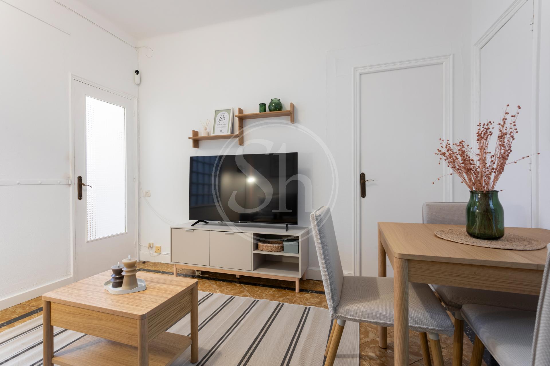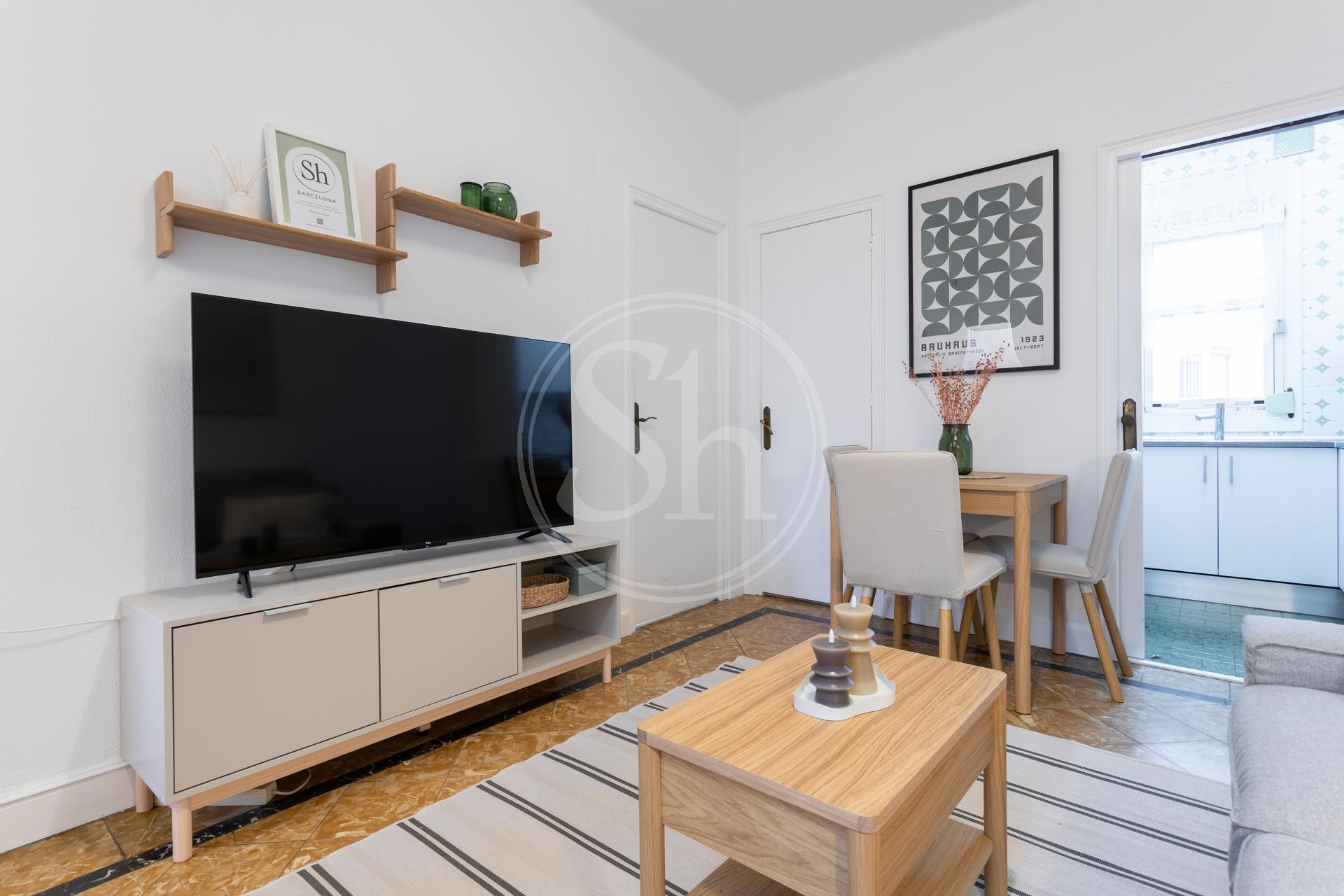ShBarcelona presenta este acogedor apartamento, totalmente amueblado y equipado, ubicado en pleno Eixample. Dispone de 45 m2, con dos habitaciones con cama doble, baño completo con ducha, cocina indepeniente completamente equipada, un bonito salón-comedor y una espectacular terraza completamente amueblada.